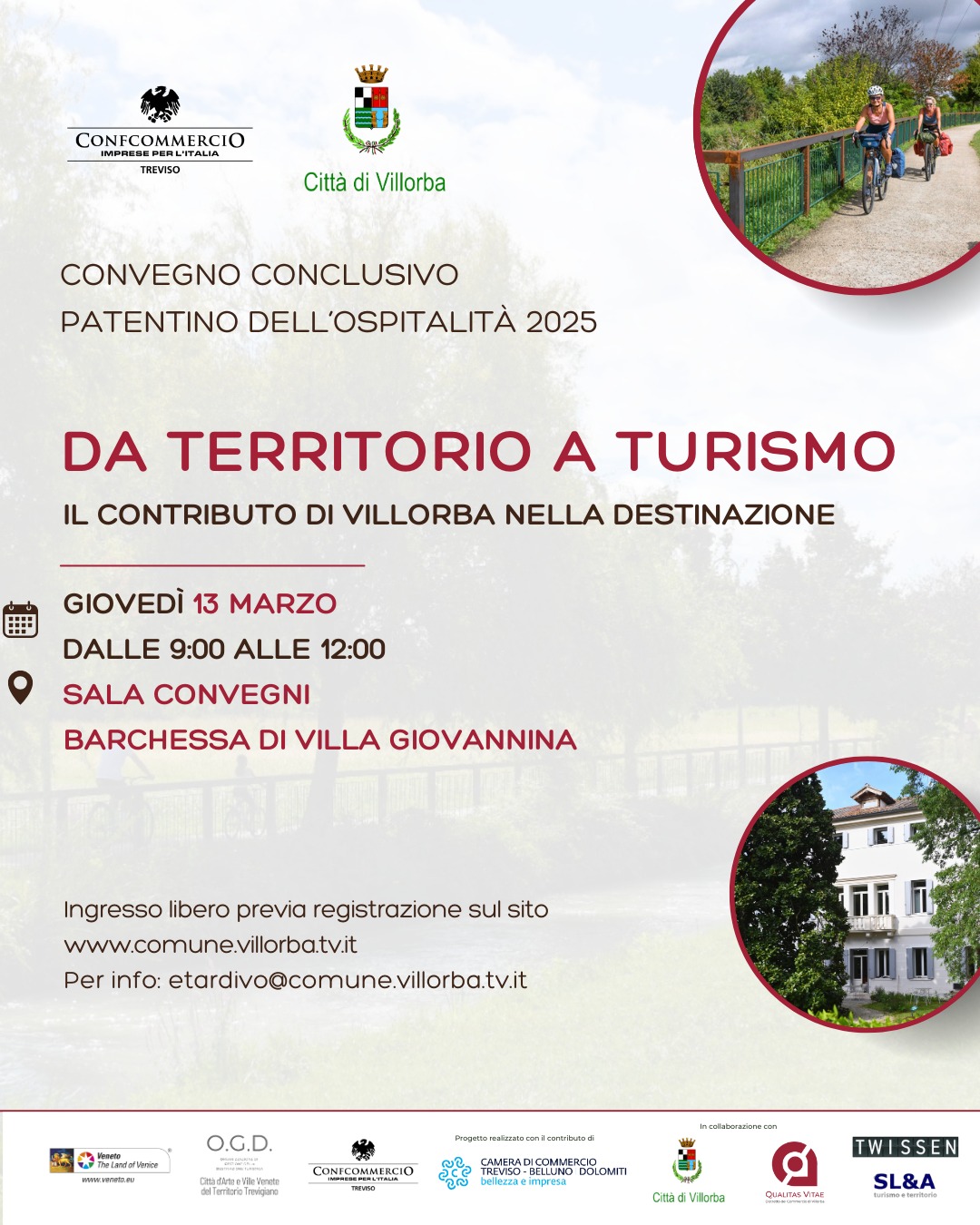 A VILLORBA 30 ESERCENTI OTTENGONO IL “PATENTINO DELL’OSPITALITA’ 2025”Giovedì 13 marzo dalle 9 alle 12 nella Sala Convegni della Barchessa di Villa Giovannina si terrà il convegno “Da territorio a turismo. Il contributo di Villorba nella destinazione”, evento conclusivo del progetto “Patentino dell’Ospitalità 2025”.