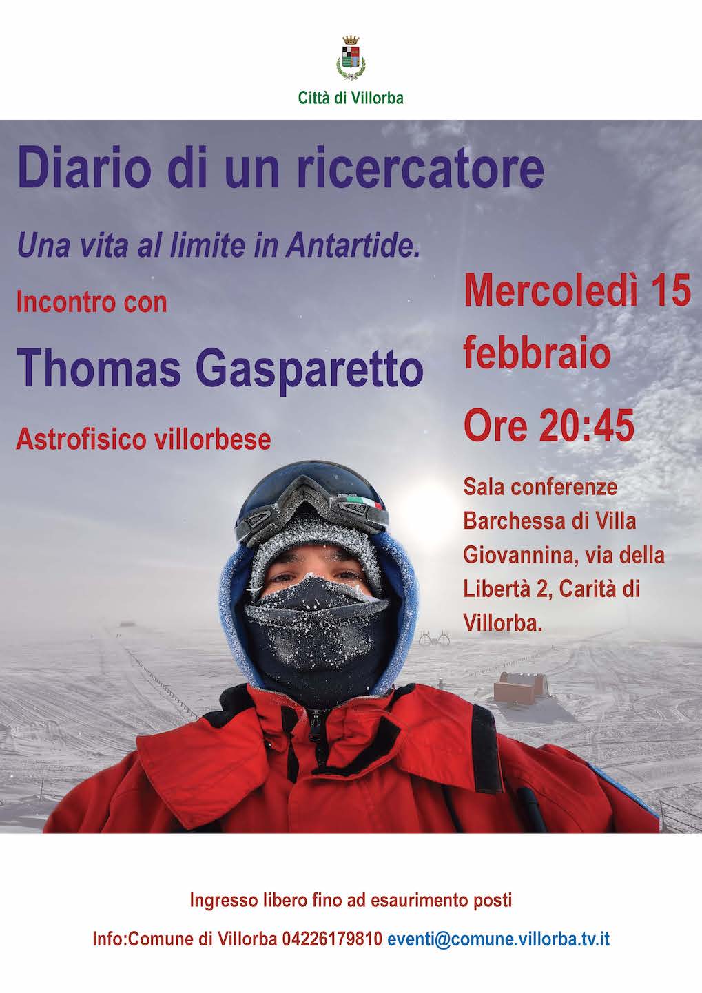 In Antartide, si sperimenta il viaggio interplanetarioMercoledì 15 febbraio nella sala conferenze della Barchessa di Villa Giovannina alle ore 20:45 si svolgerà l’incontro “Diario di un ricercatore. Una vita al limite in Antartide.” Protagonista l’astrofisico villorbese Thomas Gasparetto.