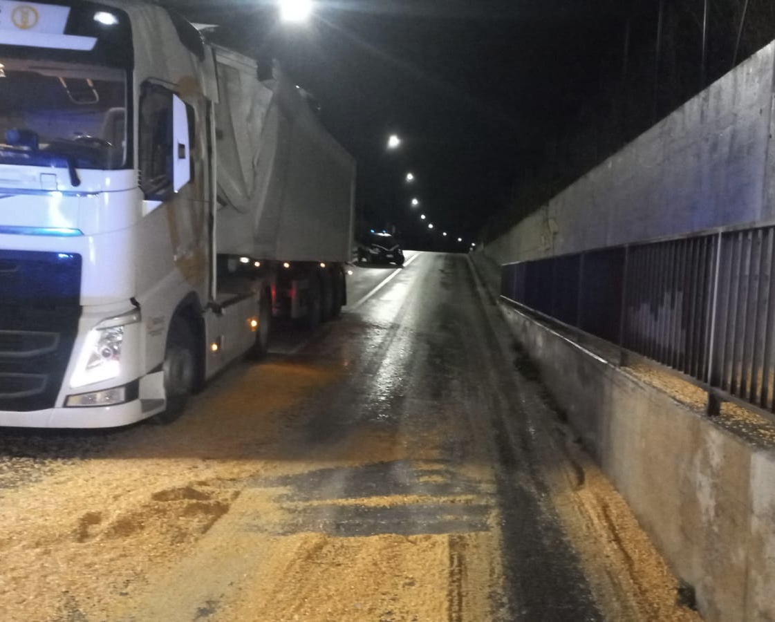 Tir Croato sparge 1.000 kg di mais nel sottopasso di via Selghere