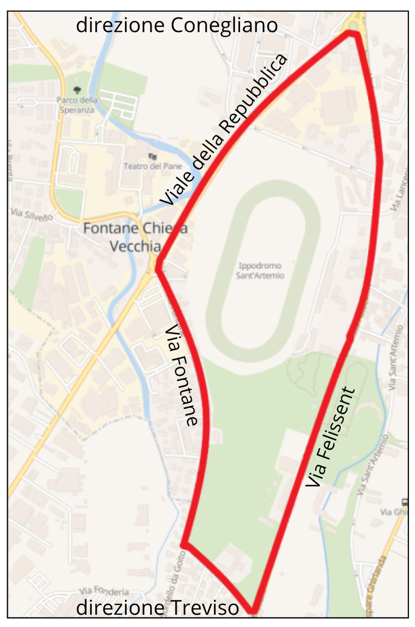 La corsia di marcia di Via Felissent adiacente l’ippodromo sarà completamente transennata, la corsia opposta sarà riservata all’accesso dei residenti, ai pubblici esercizi e ai mezzi di soccorso - dalle ore 12:00 del 14 giugno e fino alle ore 4:00 del 15 giugno e comunque fino a cessate esigenze.