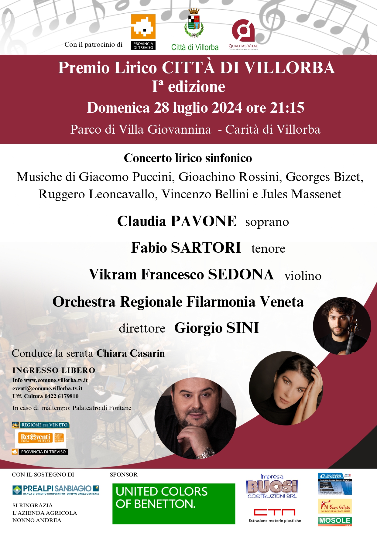 DOMANI SERA LA PRIMA EDIZIONE DEL PREMIO LIRICO “CITTÀ DI VILLORBA”Domenica 28 luglio 2024, alle 21:15 nel Parco di Villa Giovannina a Carità di Villorba si terrà la prima edizione del Premio Lirico “Città di Villorba” istituito dall’amministrazione comunale di Villorba.