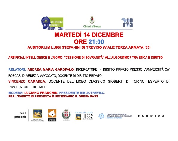 Ne parleremo martedì 14 dicembre a partire dalle ore 21:00 (online sui canali social di A.I.A. e in presenza presso l’Auditorium Luigi Stefanini di Treviso, cui si accede obbligatoriamente con Green Pass) durante l’incontro dal titolo ARTIFICIAL INTELLIGENCE E L’UOMO: “CESSIONE DI SOVRANITÀ” ALL’ALGORITMO? TRA ETICA E DIRITTO con la partecipazione di: