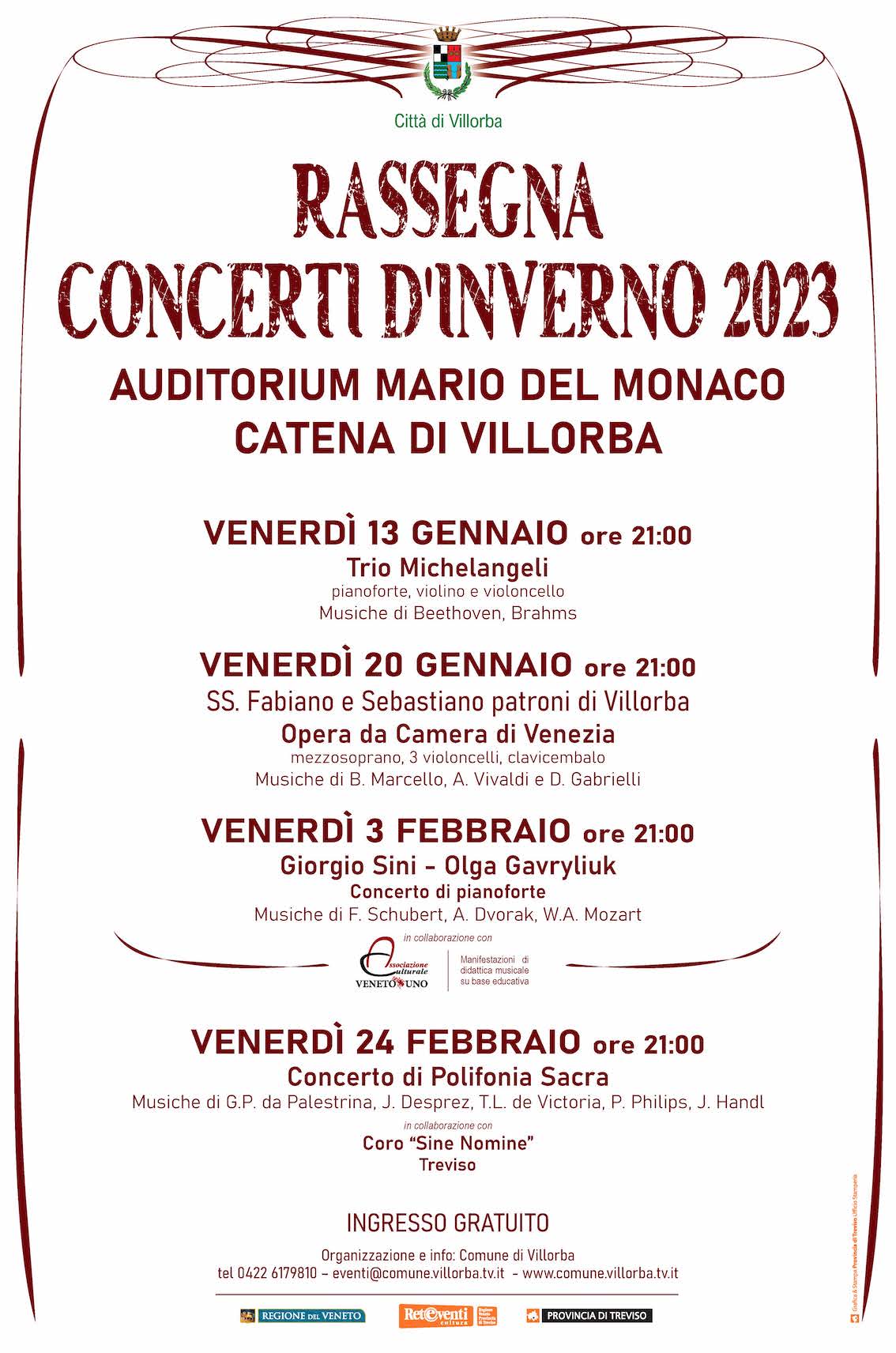 Concerti d’Inverno a Villorba: si apre con il Trio MichelangeliSaranno quattro i concerti in calendario all’Auditorium Mario del Monaco di Catena. Il primo appuntamento venerdì 13 gennaio alle ore 21:00 con il violinista Paolo Tagliamento, la violoncellista Alessandra Doninelli e il pianista Riccardo Gagliardi.