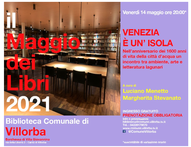 Con il titolo “Venezia è un’isola” venerdì 14 maggio alle ore 20:00 presso la sala conferenze della Barchessa di Villa Giovannina si svolgerà il primo degli incontri dedicati al maggio dei Libri 2021 e dedicato all'anniversario dei 1600 anni di vita della città d’acqua.