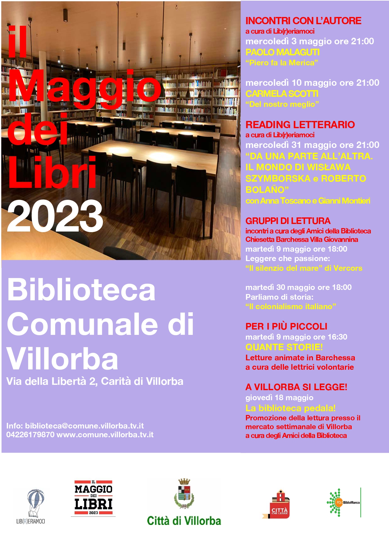 Villorba è sempre una Città che LeggeÈ tempo de “Il Maggio dei Libri” villorbese, ecco il programma: due incontri con l’autore, un Reading letterario, tre spazi narrativi di cui due dedicati ai gruppi di lettura e uno ai bambini, un’attività di promozione durante il mercato settimanale. Si parte il 3 maggio dalla Biblioteca Comunale di Villorba nella Barchessa di Villa Giovannina.