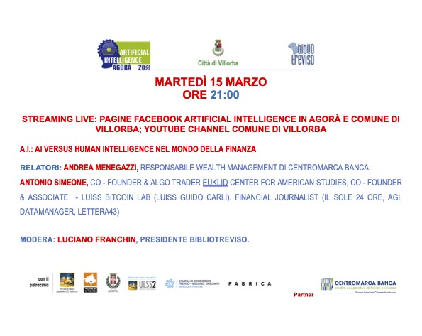 A.I.A. VERSUS HUMAN INTELLIGENCE NEL MONDO DELLA FINANZASesto appuntamento della seconda edizione di A.I.A. – Artificial Intelligence in Agorà organizzata da BiblioTreviso e Comune di Villorba con il patrocinio della Regione Veneto, della Provincia e del Comune di Treviso, dell’ULSS2 Marca Trevigiana, della Camera di Commercio di Treviso – Belluno e di Fabrica, Centro di Ricerca sulla Comunicazione del Gruppo Benetton.