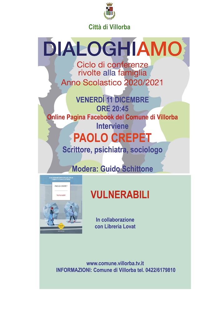 Venerdì 11 dicembre alle ore 20:45 dalla Pagina Facebook del Comune di Villorba lo scrittore, psichiatra e sociologo Paolo Crepet presenta, con la moderazione del giornalista e scrittore Guido Schittone, il libro Vulnerabili.