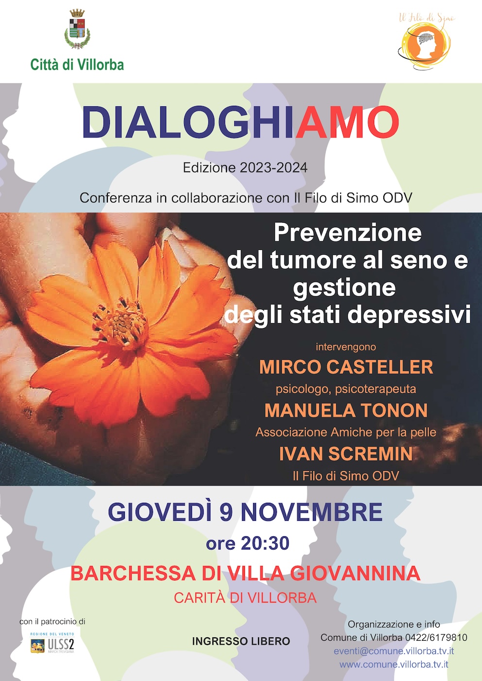 Dialoghiamo: tumore al seno e gestione degli stati depressiviGiovedì 9 novembre alle ore 20:30 nella sala conferenze della Barchessa di Villa Giovannina nuovo incontro del ciclo di conferenze villorbese dedicate alla prevenzione e alla promozione della salute.