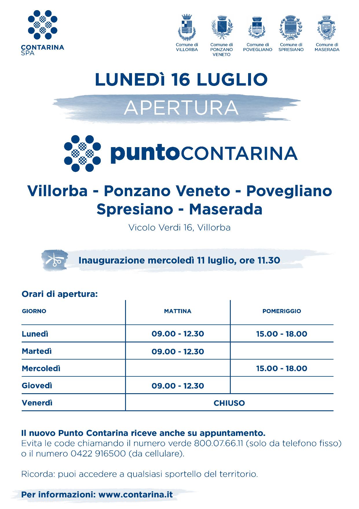 Da lunedì16 luglio sarà aperto il nuovo punto Contarina che serve i Comuni di Villorba, Ponzano, Povegliano, Spresiano, Maserada. Il nuovo Punto Contarina, situato in Vicolo Verdi 16 a Villorba, gode di un'ampia sala d'aspetto, di un comodo parcheggio e offre la possibilità di essere ricevuti su appuntamento. Sarà installato anche un distributore automatico di sacchetti, funzionante 24 ore su 24. I nuovi orari di apertura sono i seguenti: