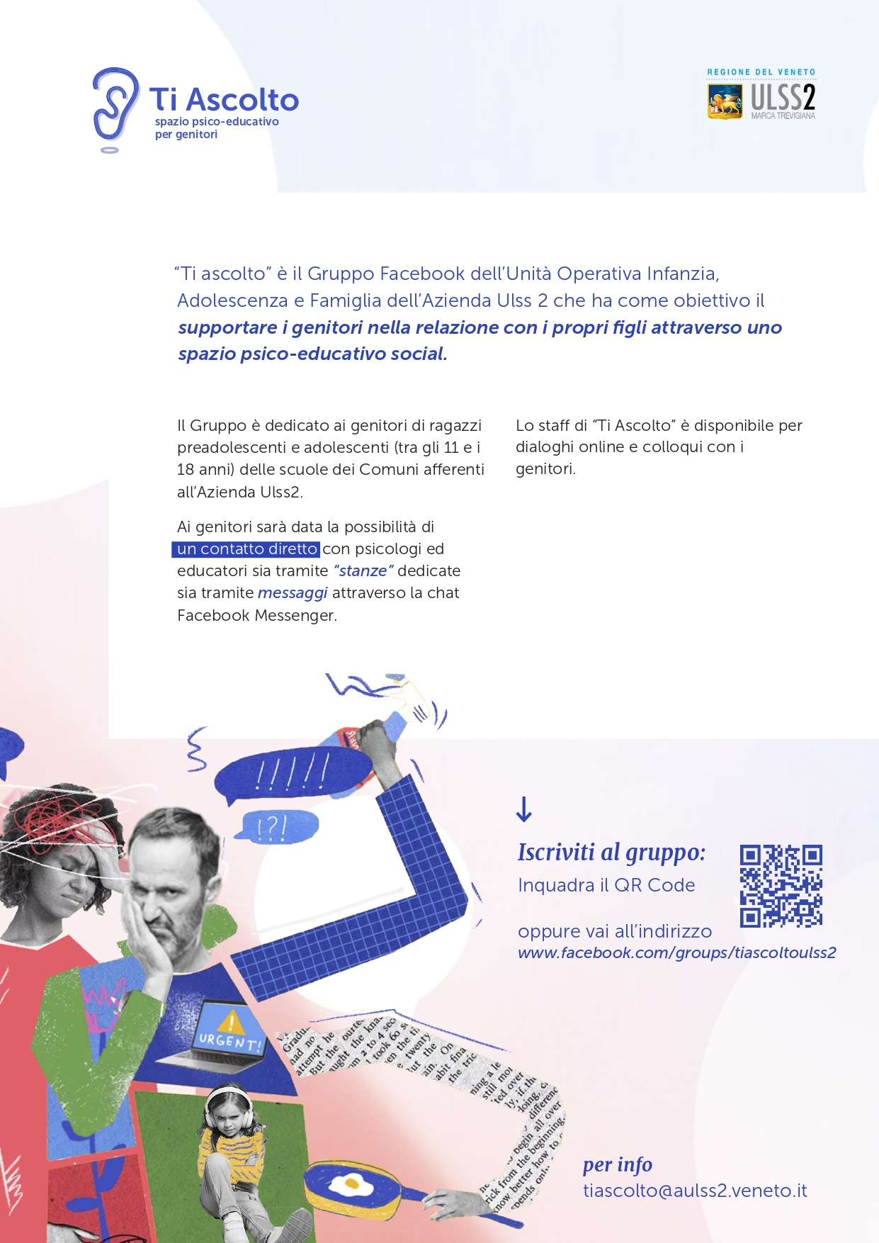 “Ti ascolto” è il Gruppo Facebook dell’Unità Operativa Infanzia, Adolescenza e Famiglia dell’Azienda Ulss 2 che ha come obiettivo il supportare i genitori nella relazione con i propri figli attraverso uno spazio psico-educativo social.